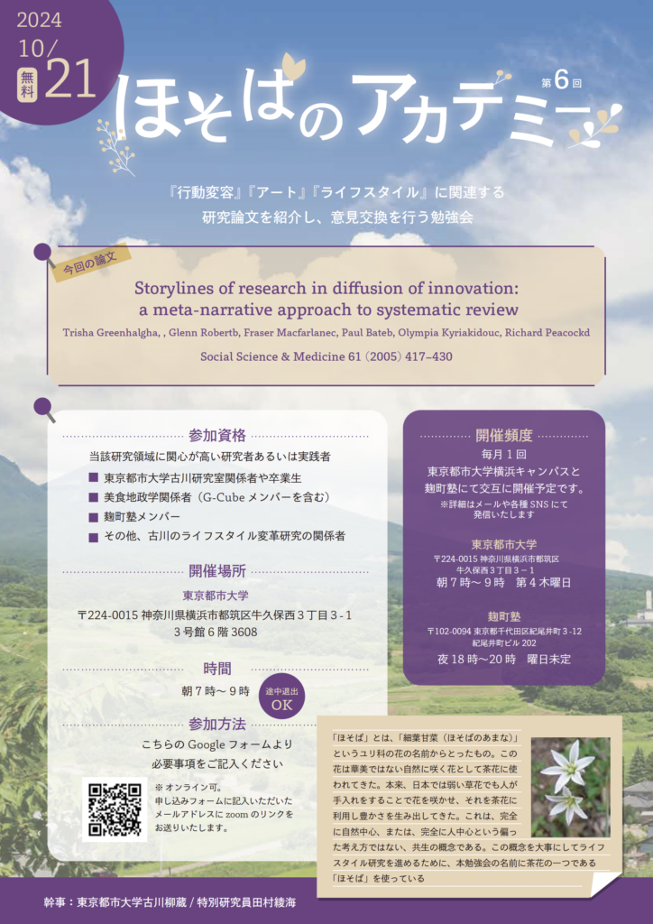2024年10月21日(月)東京都市大学総合研究所の古川柳蔵教授と田村綾海氏による、行動変容に関する論文を読む勉強会「ほそばのアカデミー」が開催されます。Zoomによるオンライン参加も可能です。