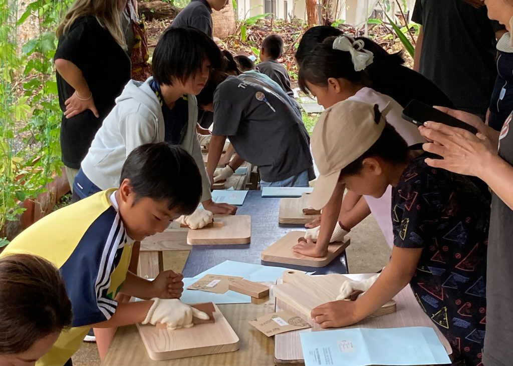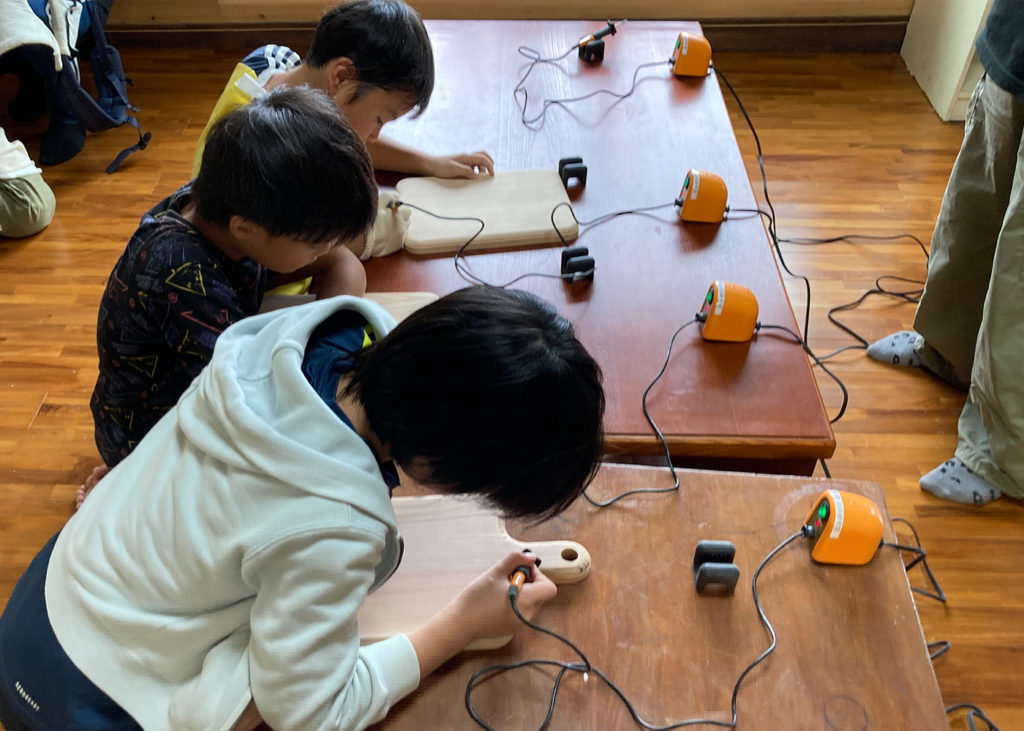 今回の講座は小学生を対象としたワークショップで、参加者の皆さんは、あらかじめ型取られたなま板をサンドペーパーで磨いた後、バーニングペン(焼きコテ)で好みのイラストを描き、自分だけのオリジナルのまな板を作りました。最後にワークショップの感想を出し合い、細部の磨き上げなど物作りの大変さや、作ったまな板を使ってどんな料理を作りたいかなどを話しました。それぞれが感想をまとめて書き出した際には、将来は環境に良い仕事を作りたいと言う意見も出ました。