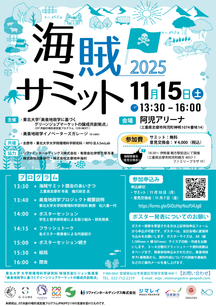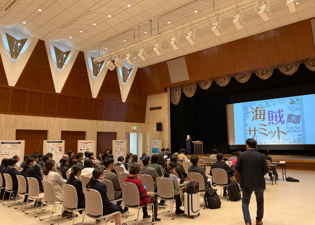 2025年11月15日(土曜)阿児アリーナ ベイホール(三重県志摩市阿児町神明1074番地14)にて海賊サミット2025を開催し、75名の方に参加いただきました。はじめに三重県志摩市長 橋爪政吉 氏から開会のご挨拶をいただき、松八重一代PLからのプロジェクト説明の後、学生や若手研究者による活動や研究などの取り組み内容を、各々がポスター発表形式で紹介しました。