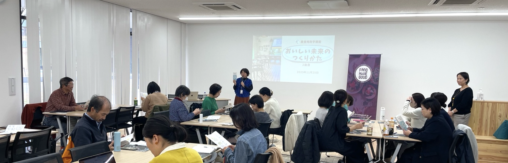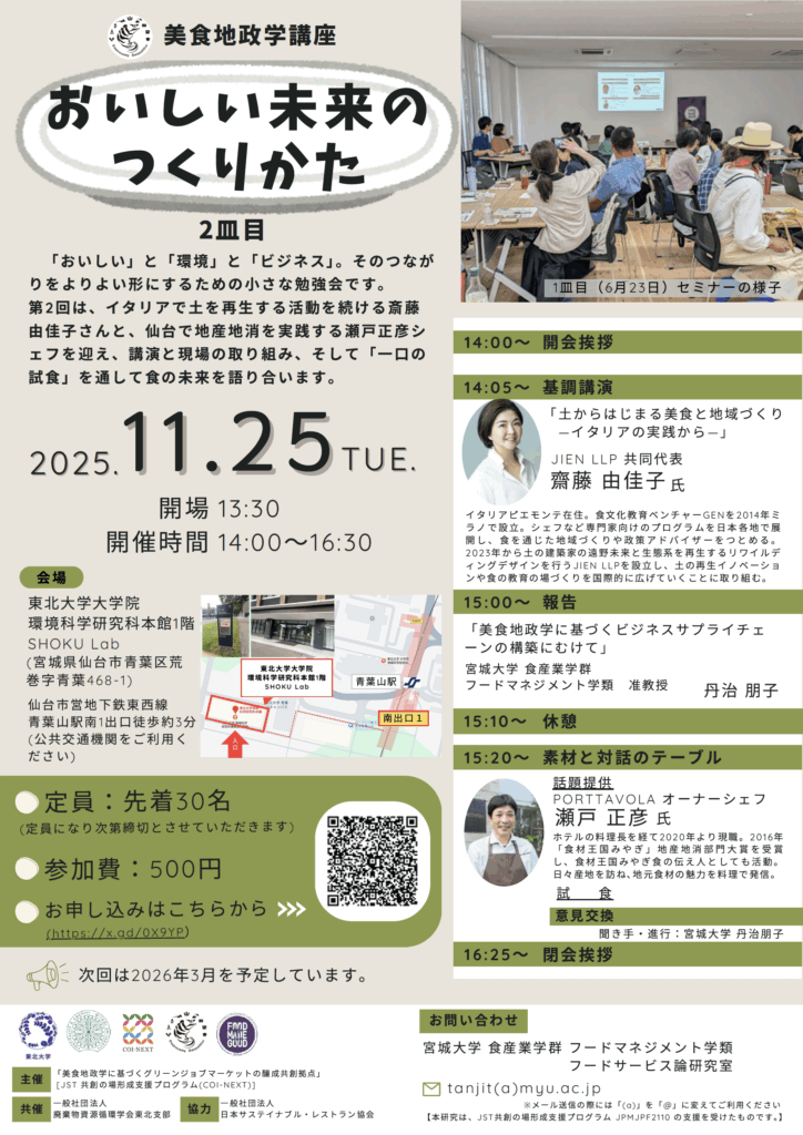2025年11月25日(火)、東北大学青葉山キャンパス 環境科学研究科 本館1階のSHOKU Labにて、美食地政学講座「おいしい未来のつくりかた 2皿目」を開催しました。当日は、飲食事業者、食品加工事業者研究者、農業生産者、学生、行政など多様な立場から33名が参加し、地域資源と食の未来について意見を交わしました。
