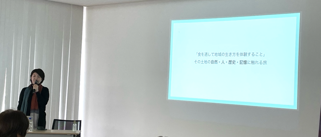 基調講演では、JIEN LLP共同代表でイタリア在住の齋藤由佳子氏より、「土からはじまる美食と地域づくり―イタリアの実践から―」というテーマにて、北イタリアを中心としたガストロノミーツーリズムの実践や、生物多様性・未利用資源(NUS)をめぐる地域の取り組みについてご紹介いただきました。白トリュフやワインに象徴される地域固有の資源の活用、協同組合を通じた地域還元の仕組み、アグリツーリズモの制度など、イタリアでの実践が共有され、参加者から高い関心が寄せられました。