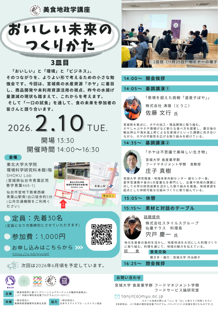 2026年2月10日(火)東北大学大学院環境科学研究科 本館において、美食地政学講座「おいしい未来のつくりかた」を開講します。