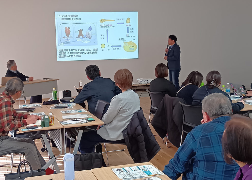 庄子氏は、廃棄される殻に含まれる動物由来セルロースに着目し、ナノファイバー化することで新素材開発が可能となり、将来的にはバッテリー触媒の代替材料になる可能性も研究されています。会場には、ホヤの殻を漂白して色を抜いたランプも紹介されました。総じて、ホヤは生物学的にも栄養学的にも価値が高く、産業・資源循環の観点からも持続的活用を考えるべき重要な地域資源であると結論づけられました。