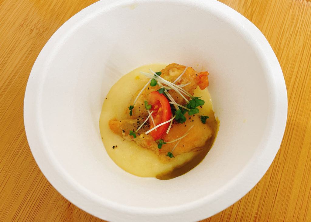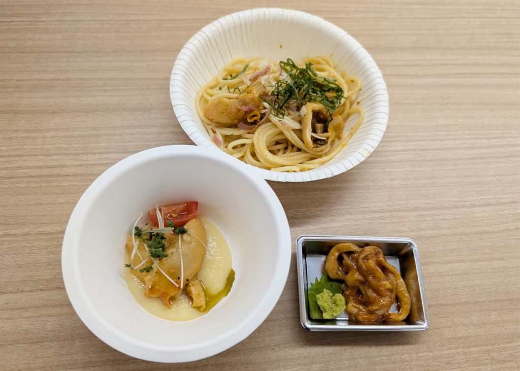 営する株式会社の仙臺テラスで料理長を務める宍戸慶一氏より、ホヤをふんだんに使用したペペロンチーノ、ホヤのステーキ(パイナップルソース)、ホヤ塩辛の三品が提供されました。冷凍によって旨味が凝縮し食感が向上する特性を活かし、ホヤを更に美味しく楽しめるメニューの広がりに、参加者からは感嘆の声が漏れました。