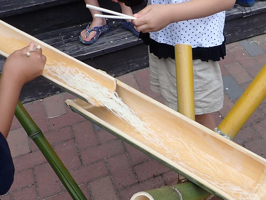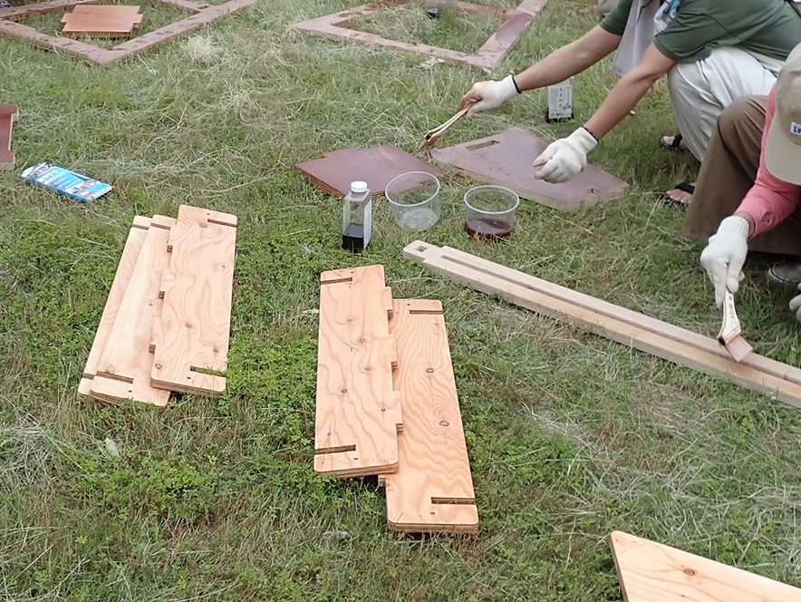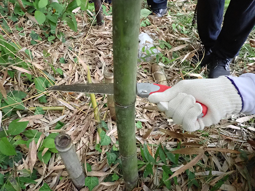 後半は竹林整備を行うグループと、前回の続きでベンチとマルシェ屋台への柿渋塗りを行うグループの2つに分かれて作業を行いました。放置竹林は里山の機能を低下させるとして全国で問題になっているそうです。キボッチャの裏山も竹林があるのでノコギリで切って整備し、切った竹は作業後の流しそうめん大会で使いました。