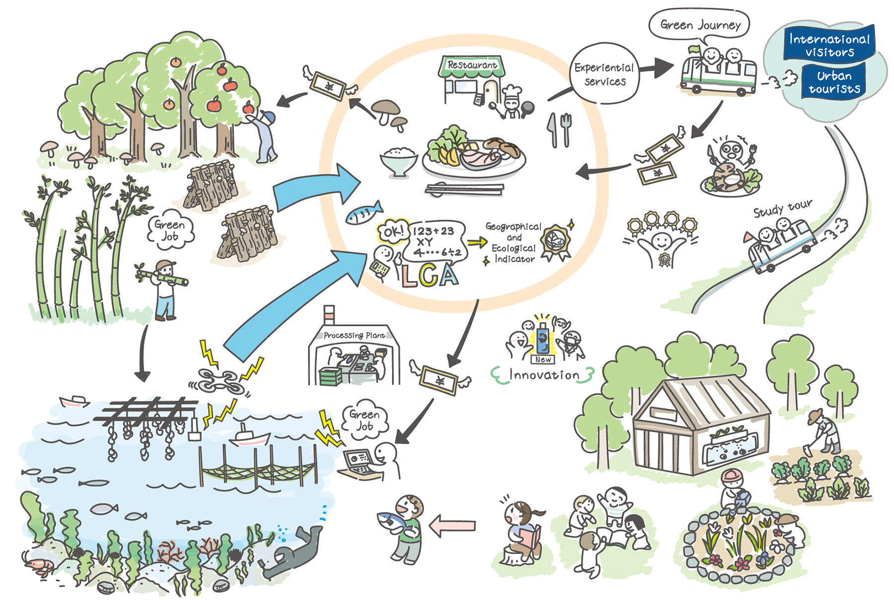 Furthermore, we will maintain and develop jobs spanning the entire food supply chain as “green jobs”, and share the significance of these roles through educational communities that involve multiple generations. By doing so, we provide future generations – including high school, university, and vocational students – the option to pursue regional green jobs as a viable career anchor. As these future generations take up green jobs in their home regions,we aim to curb youth outmigration to urban areas and revitalize local economies. Through these integrated efforts, our vision is to realize regional communities where people can lead rich, fulfilling lives in harmony with nature.